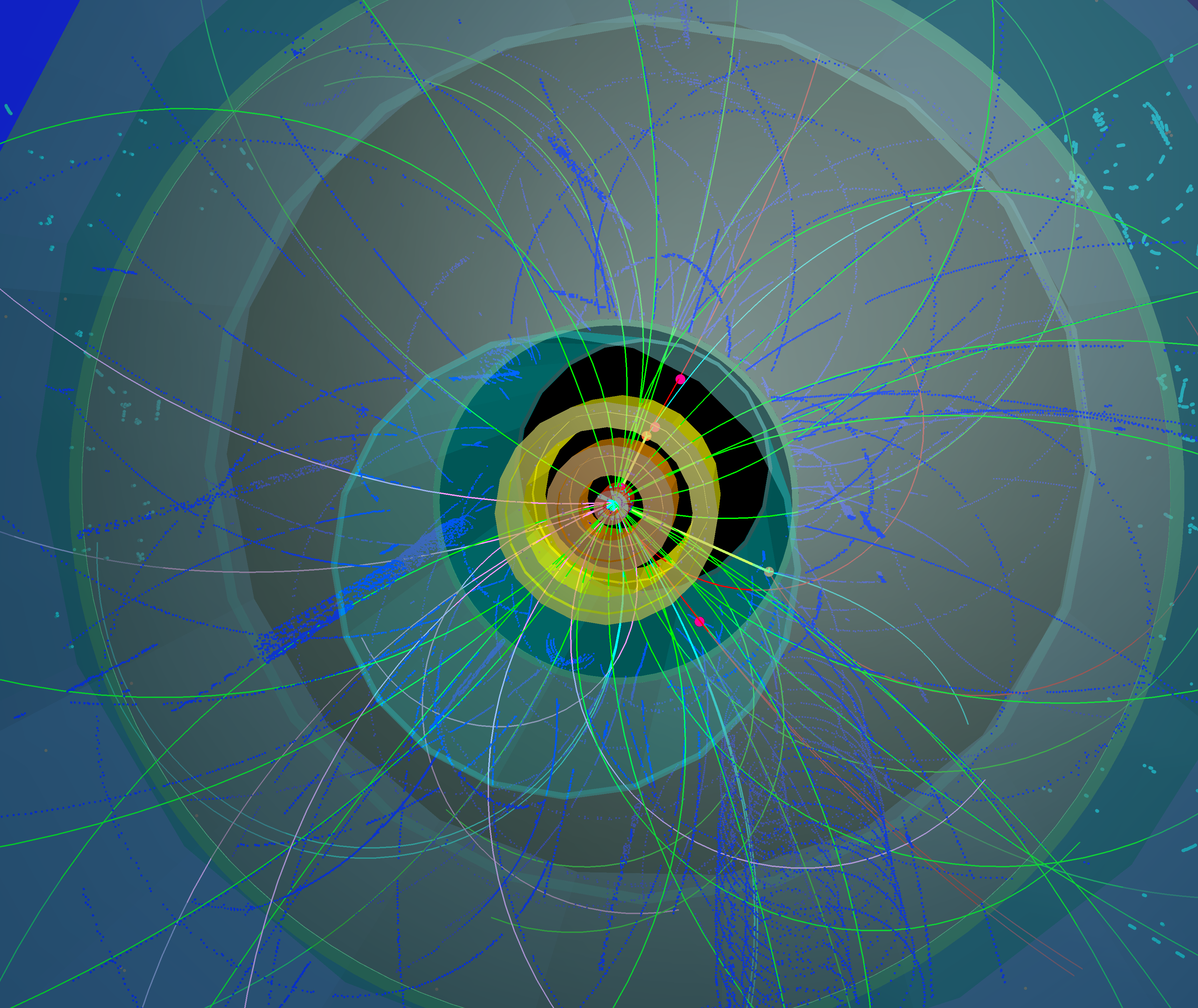 Here you can see a collision in the center of the experiment and how particles propagate through the detectors leaving their traces.