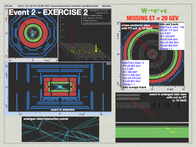 MET>25 GeV, there is exactly one electron (electric charge = -1) in the event, well isolated. It is not visible in cross-sectional view since it moves in forward direction but can be clearly identified in side view.