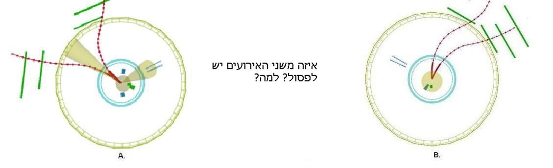 CMS Masterclass Documentation . אתם עומדים לחקור התפרקויות שמייצרות זוגות של מיואונים (muons) כדי להחליט אלו אירועים מהווים מועמדים לתהליך היווצרות של חלקיק J/Ψ (מֶזוֹן charm-anticharm או, בעברית, קֶסֶם-אנטיקסם). לאחר מכן תצרו, עבור אירועים שעברו את "טריגר התלמיד", היסטוגרמה במטרה לחשב את מסת החלקיק. רקע כאשר חלקיק J/Ψ מתפרק, הוא מייצר בדרך כלל זוג של מיואונים. התבוננו בקפידה בשני האירועים שלמטה. האם תוכלו למצוא עדות לזוגות של מיואונים (עקבות אדומות) באחד האירועים או בשניהם? האם אחד מהם מהווה מועמד לתהליך J/Ψ? האם העדות חלשה או חזקה? באיזו מידה אתם בטוחים במסקנה שלכם?