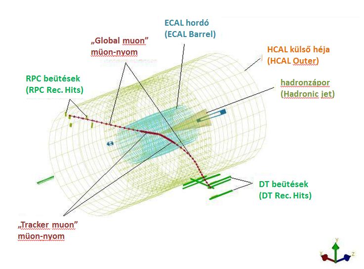 • Ha a két részecskepálya ugyanabba az irányba görbül a szolenoid mágnes belsejében (a HCAL detektor külső héján belül), akkor töltésük előjele azonos és így nem származhatnak a J/Ψ bomlásából. (Ennek alapján milyen töltése lehet a J/Ψ részecskének?)