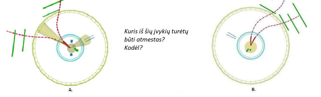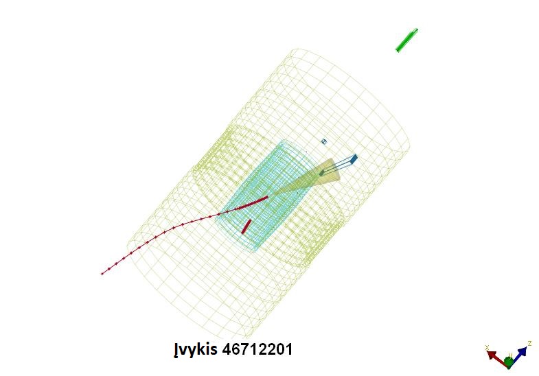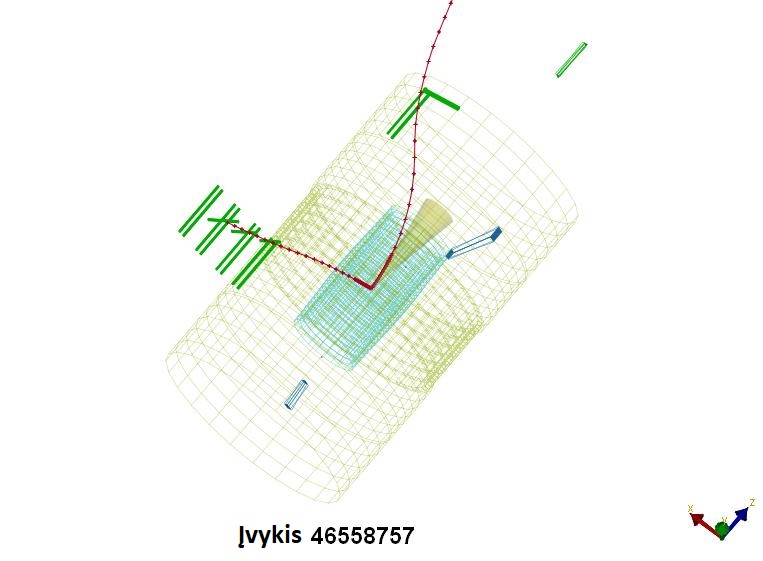 CMS meistriškumo pamokos dokumentacijoje (anglų kalba). Jūs nagrinėsite „studento trigerį“ praėjusius ir miuonų poras turinčius įvykius, kad nustatytumėte, kurie įvykiai yra J/Ψ (mezonų, sudarytų iš žaviojo ir antižaviojo kvarkų) kandidatai, ir sudarytumėte apskaičiuotų mezono masių histogramą. Įvadas Kai J/Ψ dalelė skyla, paprastai atsiranda miuonų pora. Atidžiai pažiūrėkite į žemiau pavaizduotus įvykius. Raudonos linijos ženklina miuonų trajektorijas, paprastai vadinamas „trekais“. Ar įvykiuose yra miuonų porų požymių? Ar kuris nors galėtų būti J/Ψ kandidatas? Ar požymiai stiprūs? Ar pasitikite savo išvadomis?