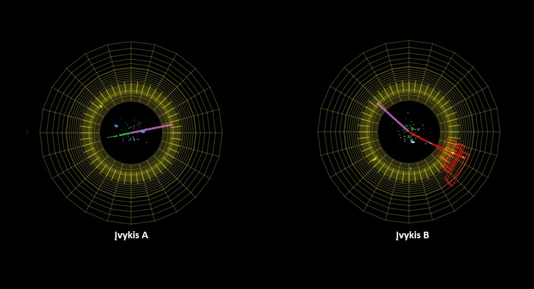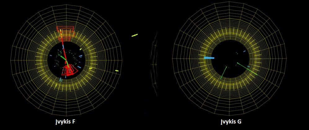 Spustelėkite paveikslėlį kairėje, kad jį padidintumėte ir galėtumėte atidžiau apžiūrėti. Abu įvykiai yra Higgs'o kandidatai. Viename iš jų yra du fotonai (du žali energijos stulpai ECAL detektoriuje be jokių atitinkamų trekų). Kitame – galimas Higgs'o skilimas į du Z bozonus. Kaip manote, kuris yra kuris?