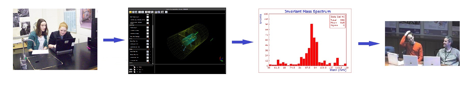 Jūs su kolega tiriate pavaizduotą įvykį, jį interpretuojate ir naudojate Excel skaičiuoklę stebėjimų užrašymui. Skaičiuoklė padės jums rasti pagrindinius santykius ir sudaryti Z bozono kandidatų masės histogramas. Jūsų mentorius padeda visai grupei suprasti rezultatus prieš juos nusiunčiant vaizdo konferencijos moderatoriams.