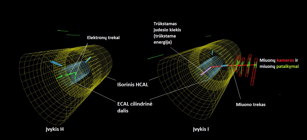 - Higgs'as skyla į du Z bozonus. Z bozonai skyla į leptonus, kaip aprašyta aukščiau, taigi gauname 4 leptonų trekus: dvi miuonų poras (2 × μ–μ+), dvi elektronų poras