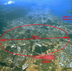 La imatge és un mapa esquemàtic de l'accelerador amb l'experiment LHC dibuixat. S'hi distingeix el CERN, la zona on estan els científics, i els quatre detectors CMS, LHC-B, ATLAS i ALICE. A l'esquerra de la imatge s'hi troba el llac de Ginebra i Ginebra. Al fons s'hi ha marcat la frontera franco-suïssa.
