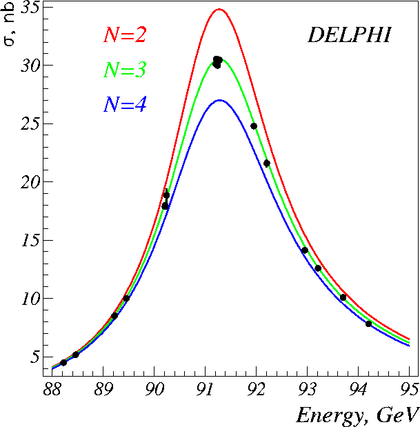 Le tre linee colorate corrispondono alle previsioni della teoria per questo grafico per due, tre e Quattro famiglie di particelle. Nota che il picco è più altro per due famiglie e più baso per quattro. Ciò accade perché più piccolo è il numero di famiglie, più grande è la frazione di decadimenti della Z che producono particelle visibili, e quindi più alto è il picco. I dati sono in ottimo accordo con la curva per tre famiglie, e questo ci dice che, se le nostre teorie sono giuste, allora le tre famiglie di particelle che già conosciamo sono già tutto quanto c’è da conoscere. Ciò che non ci dice, tuttavia, è perché la natura abbia scelto di fare due copie della famiglia fondamentale di particelle. Questo è un problema che verrà esplorato dalla nuova generazione di fisici… forse anche da te
