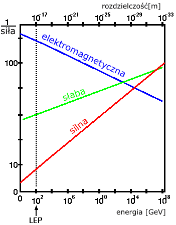Może się to wydawać zaskakujące, lecz mimo wielkich różnic pomiędzy natężeniami oddziaływań fizycy sądzą, że wszystkie są przejawem tego samego zjawiska. Stworzenie jednej teorii opisującej wszystkie oddziaływania jest ostatecznym celem współczesnej fizyki. Jednak ważna wskazówka świadcząca o tym, że wszystkie oddziaływania mogą być tym samym wynika stąd, że stałe sprzężenia wcale nie są stałe, lecz zmieniają się wraz z energią zjawiska, w którym są mierzone. Cytowana powyżej wartość as jest słuszna jedynie dla zjawisk występujących przy energii około 91 GeV, odpowiadającej masie cząstki Z. Podobnie, stała sprzężenia dla oddziaływań elektromagnetycznych, wynosząca około 1/137, została zmierzona w badaniach nad zjawiskami atomowymi. Kiedy jednak mierzy się ją przy wyższych energiach, jak w akceleratorze LEP, jej wartość wzrasta do około 1/128! Mówi się, że wartość stałej sprzężenia 'biegnie' wraz z energią, a same stałe sprzężenia określa się zwykle jako biegnące.