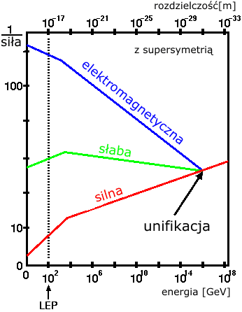 Wydaje się, że bez SUSY natężenia oddziaływań nigdy się nie spotkają. SUSY modyfikuje sposób, w jaki ich wartości zbliżają się do siebie, co prowadzi do unifikacji.