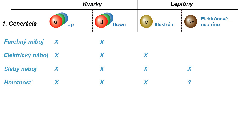 Silná interakcia drží spolu kvarky, aby vytvárali protóny a neutróny, zbytková silná interakcia drží spolu protóny a neutróny, aby vytvárali jadrá – podobne ako van der Waalsova interakcia pôsobí v molekulách. Náboj silnej interakcie sa nazýva farba. Existujú tri druhy farby – červená, modrá a zelená – jej nosičmi sú kvarky. Všetky častice vytvorené z kvarkov sú však bezfarebné. Napríklad protóny a neutróny obsahujú tri kvarky, po jednom z každej farby a ich zmes, práve tak ako zmes skutočných farieb, dáva bielu. Iné častice, nazývané mezóny, sú vytvorené z kvarku a antikvarku. Tu má antikvark „doplnkovú“ farbu, alebo antifarbu k farbe, ktorú má kvark, čo vo výsledku opäť dáva bielu.