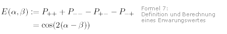 Der Wert für E ergibt sich aus den Gleichungen 5 und 6 und ein paar Umformungen mit Sinus und Kosinus. E entspricht nun dem Erwartungswert der Messung M(Alpha)M(Beta), wobei das Ergebnis von M(a) auf den Zustand |a> angewendet "1" lautet und auf den Zustand |a+90> angewendet "-1" beträgt: