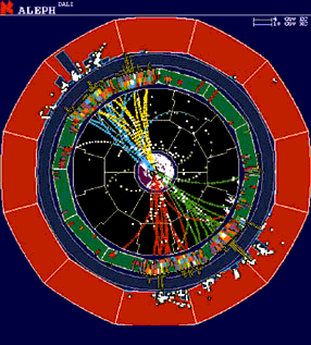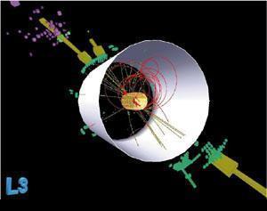 The event on the right, from the ALEPH detector, shows the decay of a candidate Higgs particle into four emerging sprays ("jets") of particles. The red/yellow pair and the blue/green pair emerge back to back, suggesting the production of a Higgs and a Z boson. The image below shows a view of a candidate Higgs event from the L3 experiment. Some of the energy is dissipated as neutrinos and is therefore not visible.