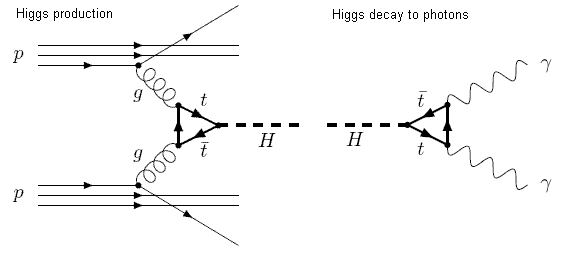 The Feynman diagrams below show possible production and decay paths for the Higgs. The Higgs only interacts directly with particles that have mass. In fact, the whole idea behind the Higgs is that its interactions actually cause those particles with mass to have mass in the first place. The Higgs doesn't, indeed it cannot, interact directly with massless particles such as photons and gluons. In a hadronic collision the Higgs is produced in a two-gluon fusion process via a triangular loop of virtual top quarks. In the decay process, a loop of virtual top quarks allows the Higgs to decay into two photons.