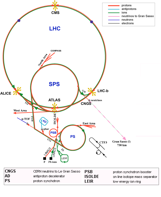 The Large Hadron Collider (LHC) is being built at CERN on the French Swiss border near Geneva. The particles will be accelerated into two beams which travel in opposite directions around the 27km circular tunnel which formerly contained the LEP accelerator. Each proton beam flying around the LHC will have an energy of 7 TeV, so when two protons collide the collision energy will be 14 TeV. These collision events have the energy necessary to probe areas of Physics beyond the reach of any other experiments on Earth.