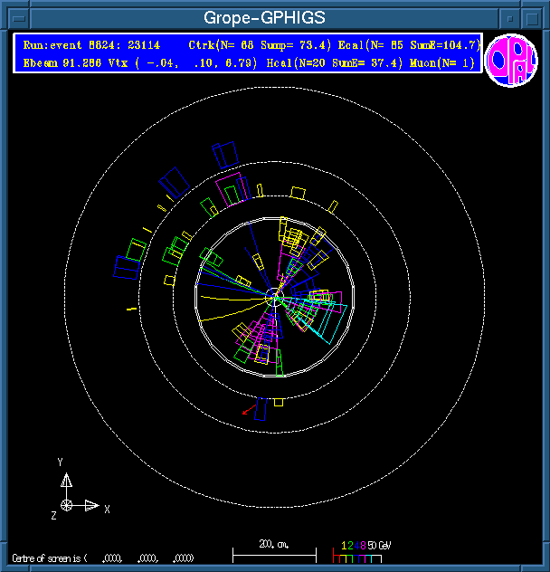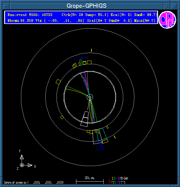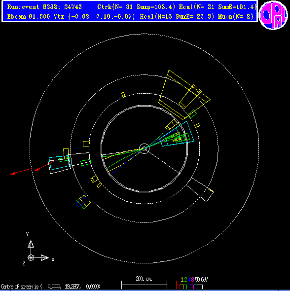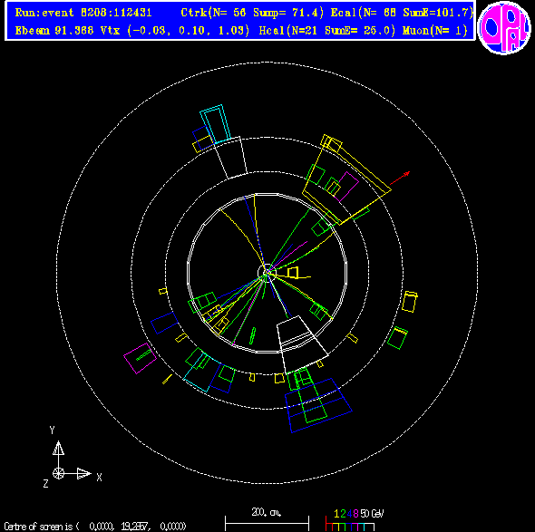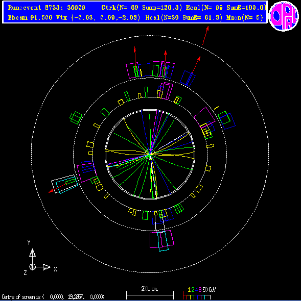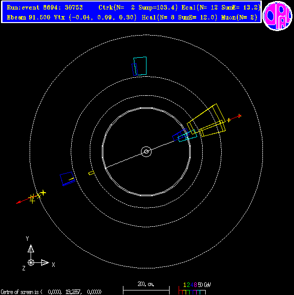 Ein wertvoller Hinweis! Im Aufgabenteil 5 haben Sie auf einige kompliziertere Typen von Ereignissen geschaut. Hier werden Sie einige Z0 Zerfälle kennenlernen, die mit der Produktion von energiereiche Photonen in Teilchen- Antiteilchen Paar enthaltenden Ereignisse verbunden sind. Wo es nötig ist, sind beide, die Front- und Seitenansicht gegeben, um Ihnen bei der Entscheidung zu helfen, welcher Zerfallstyp stattgefunden hat.